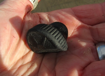 Cork, glass and even wood were tried. In the late 1800s, stoppers like this one found by Ruth became popular made from tough vulcanite, a type of dense rubber.