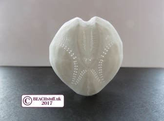Sand dollars are the tests (skeletons) of flattish urchins. The ones on the left are from Pea Urchins and are just a few millimetres wide. Occasionally, tantalising pieces of much larger sand dollars wash up like this one below left. They all have this star shape in common (as do the sea potatoes above) which can be seen really clearly in this one below that I found in exotic parts.
