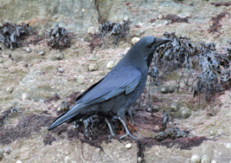 Jackdaws have a charming habit of strutting with their heads held at a fantastically pompous angle (have a look at the video below). They, along with other members of the crow family, search the strandline for insects and whatever else they can find that might be tasty. Jackdaws are related to crows (below right) but seem a bit more friendly and a little more camp.