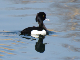 Above: the black and white male tufted duck is in the foreground with the brown female in the background.